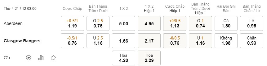 Tỉ lệ kèo Aberdeen vs Rangers