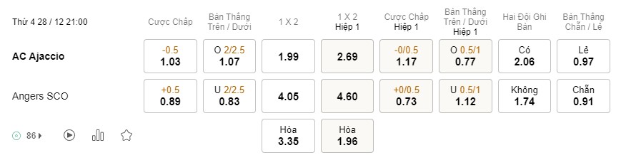 Tỉ lệ kèo Ajaccio vs Angers