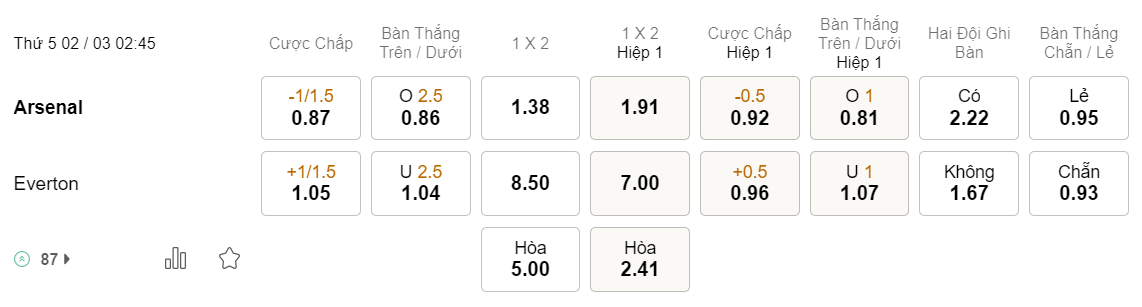 Soi kèo châu Á Arsenal vs Everton: 0.87*1/1.5*1.05