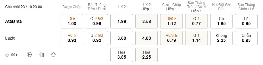Soi kèo châu Á Atalanta vs Lazio: 1.00*0.5*0.93