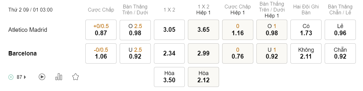 Soi kèo châu Á Atletico Madrid vs Barcelona: 0.87*0/0.5*1.06