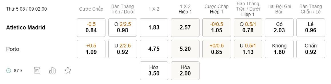 Tỉ lệ kèo Atletico Madrid vs Porto