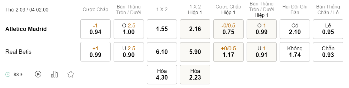 Tỉ lệ kèo Atletico vs Betis