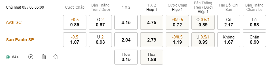 Soi kèo châu Á Avai vs Sao Paulo: 0.85*0.5*1.07