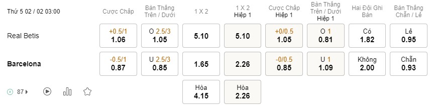 Tỉ lệ kèo Betis vs Barcelona