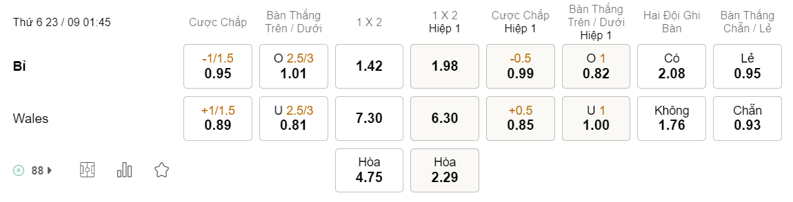 Soi kèo châu Á Bỉ vs Wales: 0.95*1/1.5*0.89