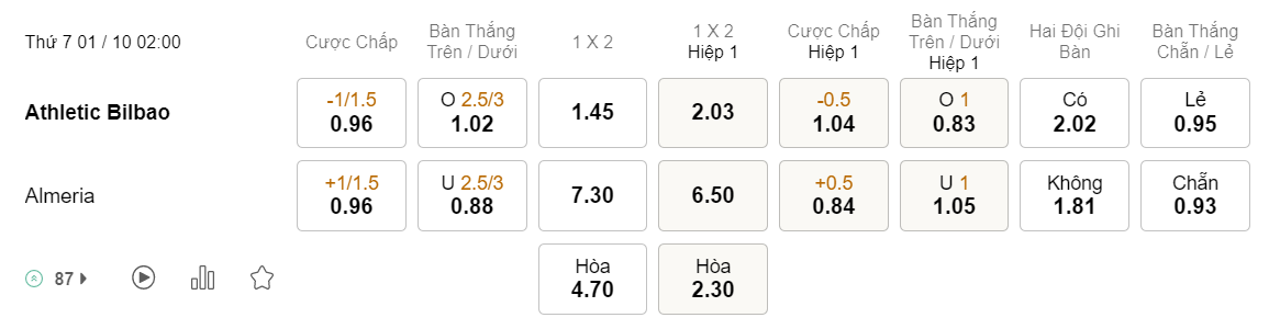Soi kèo hiệp 1 Bilbao vs Almeria: 1.04*0.5*0.84