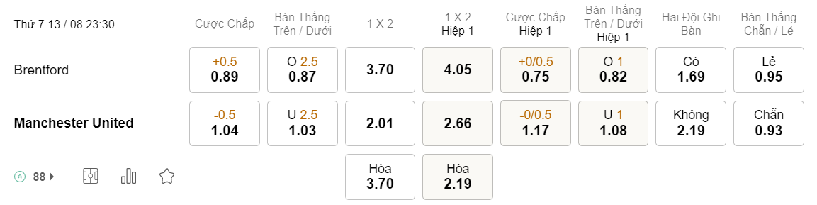 Tỉ lệ kèo Brentford vs MU