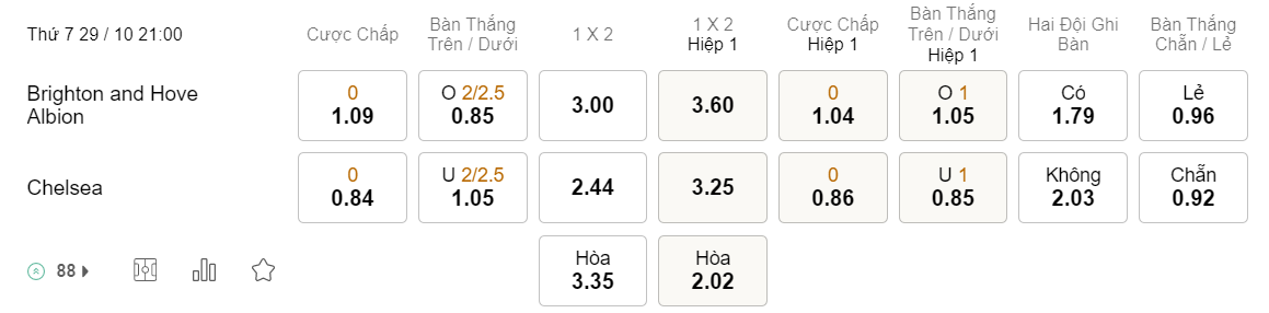 Soi kèo hiệp 1 Brighton vs Chelsea: 1.04*0*0.86