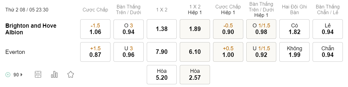 Soi kèo hiệp 1 Brighton vs Everton: 0.90*0.5*1.00