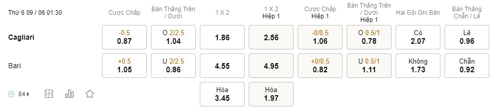 Tỉ lệ kèo Cagliari vs Bari
