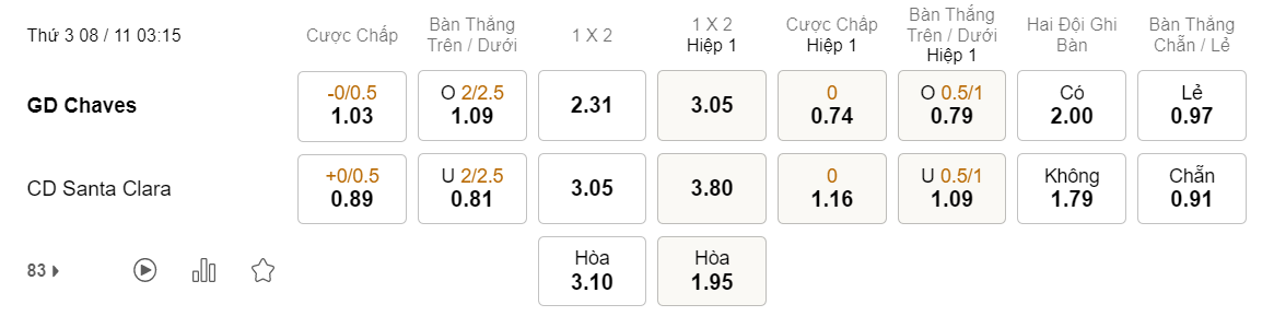 Tỉ lệ kèo Chaves vs Santa Clara
