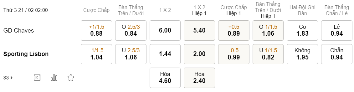 Sporting Lisbon giành tới 4 thắng lợi trong 5 lần gần nhất trạm chán Chaves và 3 trong số đó, đội khách đã mở tỉ số ngay trong hiệp 1. Vì vậy, khả năng cao bàn thắng cũng sẽ tới với Sporting Lisbon ngay ở 45 phút thi đấu đầu tiên.