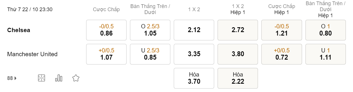 Tỉ lệ kèo Chelsea vs MU