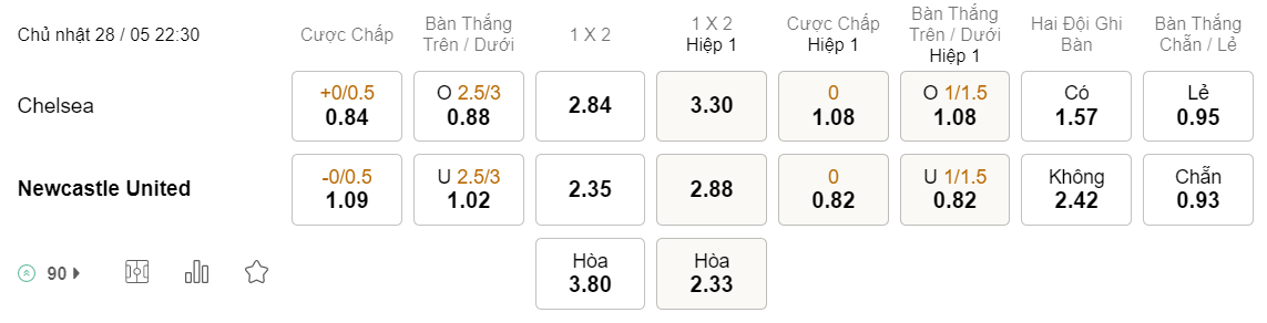 Tỉ lệ kèo Chelsea vs Newcastle