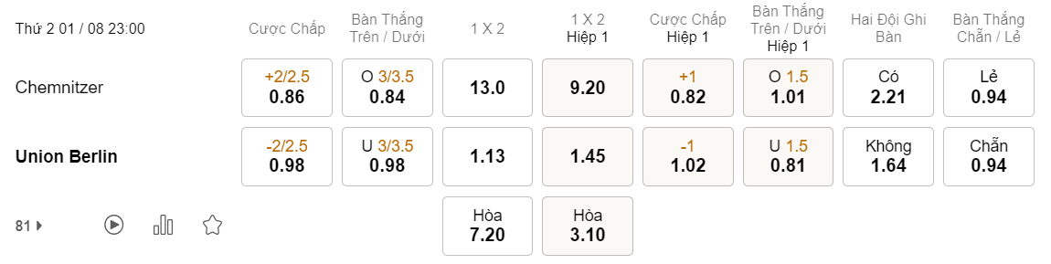 Soi kèo hiệp 1 Chemnitzer vs Union Berlin: 0.82*1*1.02