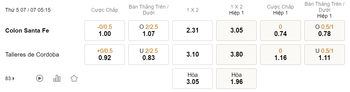 Tỉ lệ kèo Colon vs Talleres