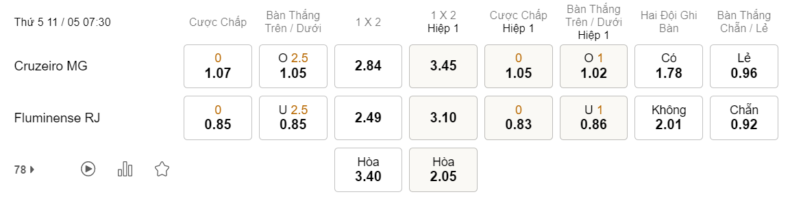 Tỉ lệ kèo Cruzeiro vs Fluminense