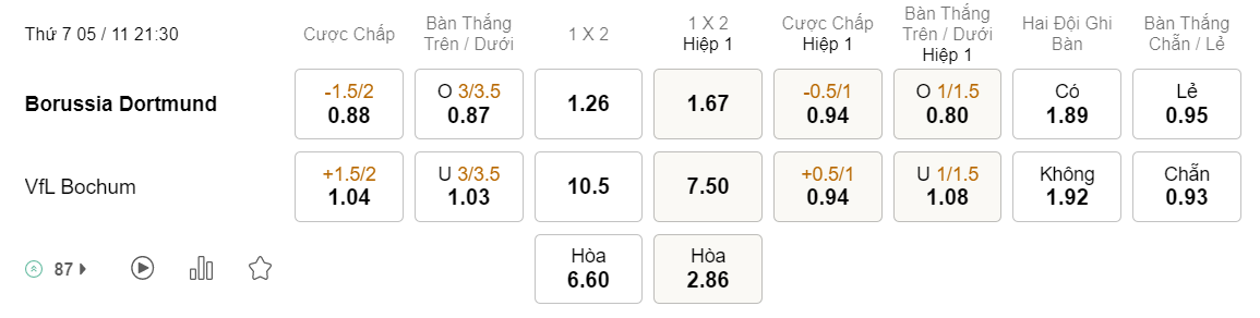 Soi kèo châu Á Dortmund vs Bochum: 0.88*1.5/2*1.04