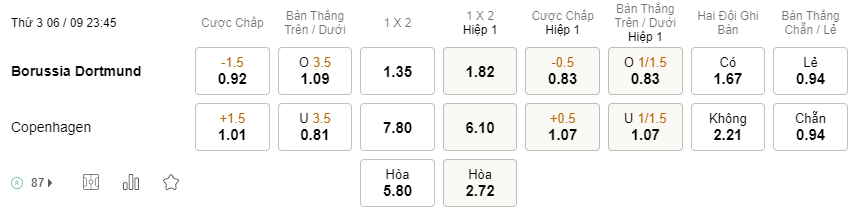 Tỉ lệ kèo Dortmund vs Copenhagen