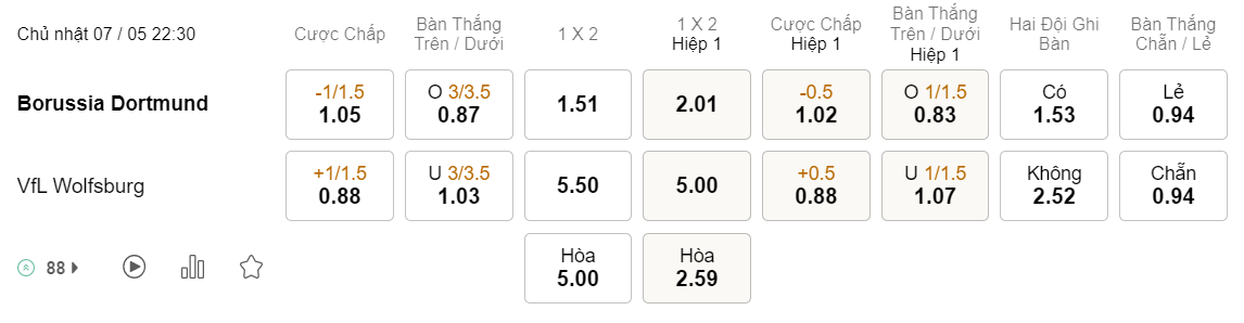 Soi kèo hiệp 1 Dortmund vs Wolfsburg: 1.02*0.5*0.88