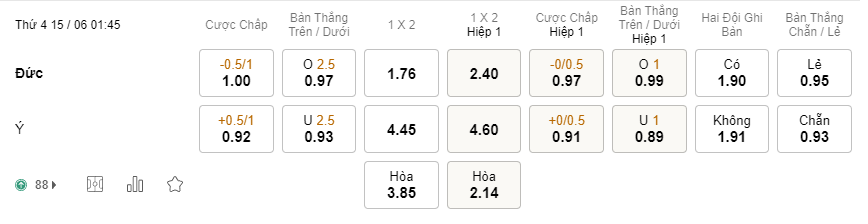 Tỉ lệ kèo Đức vs Ý