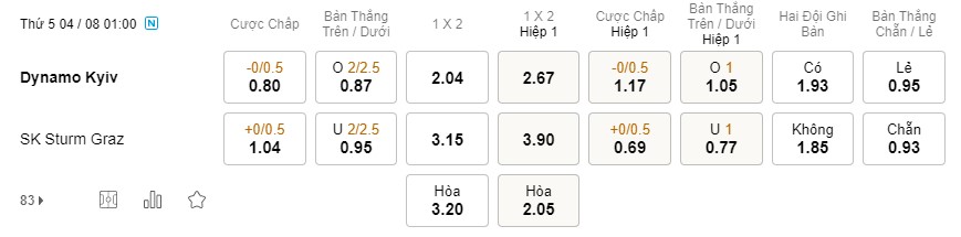 Soi kèo châu Á Dynamo Kiev vs Sturm Graz: 0.80*0/0.5*1.04