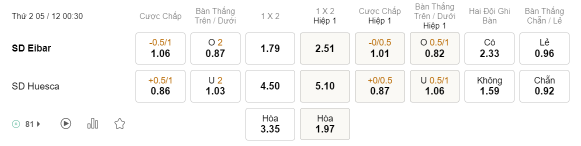 Soi kèo hiệp 1 Eibar vs Huesca: 1.01*0/0.5*0.87