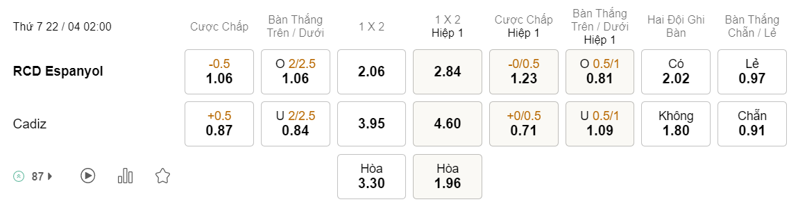 Soi kèo châu Á Espanyol vs Cadiz: 1.06*0.5*0.87