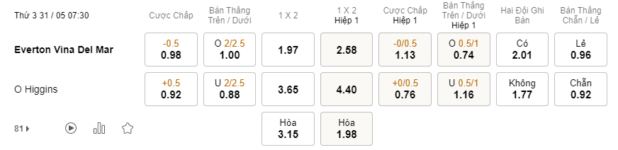Một chiến thắng cho đội chủ nhà lại càng được củng cố hơn khi O’Higgins đang có phong độ bết bát trong thời gian gần đây. Cụ thể, trong 5 trận gần nhất trên tất cả các đấu trường, các vị khách trong trận cầu sắp tới chỉ thắng duy nhất 1, họ hòa 2 và để thua 2. Vì vậy, phải đối đầu với Everton thời điểm này có thể coi là thử thách quá sức cho O’Higgins, và các chuyên gia cũng nhận định, sẽ là hợp lý hơn khi nghiêng về cửa thắng của đội nhà trong trận đấu này.