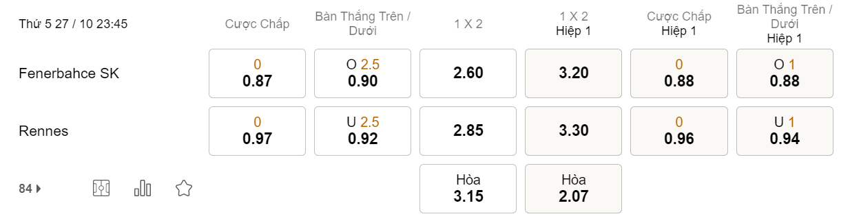 Tỉ lệ kèo Fenerbahce vs Rennes