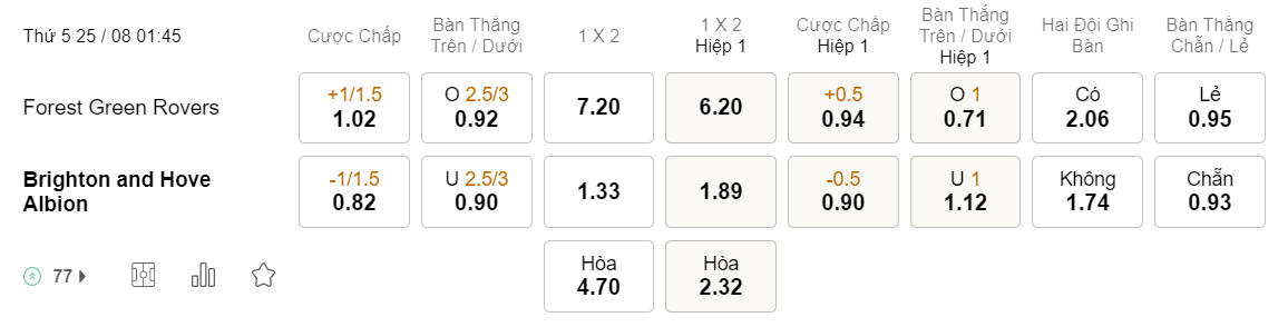 Tỉ lệ kèo Forest Green vs Brighton