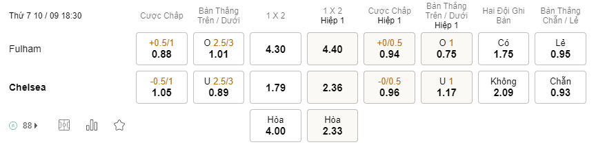 Soi kèo châu Á Fulham vs Chelsea: 0.88*0.5/1*1.05