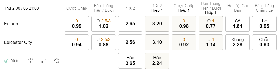 Tỉ lệ kèo Fulham vs Leicester