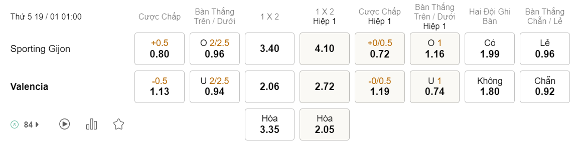 Soi kèo hiệp 1 Gijon vs Valencia: 0.72*0/0.5*1.19