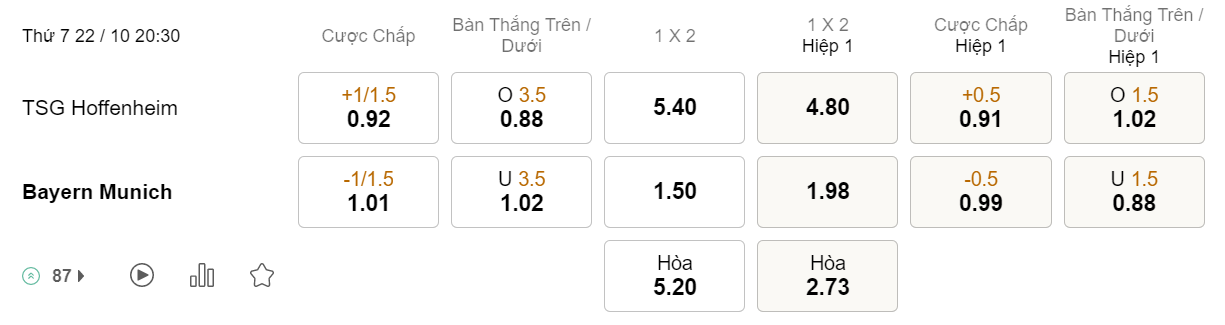 Soi kèo châu Á Hoffenheim vs Bayern: 0.92*1/1.5*1.01