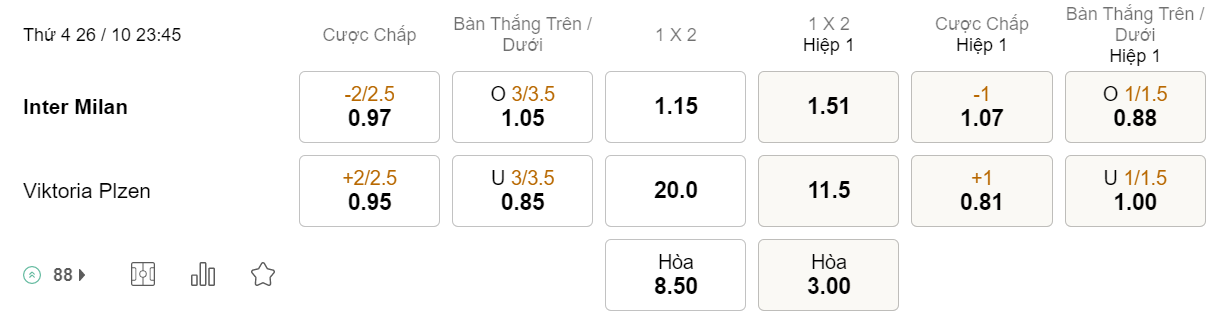 Soi kèo hiệp 1 Inter vs Plzen: 1.07*1*0.81