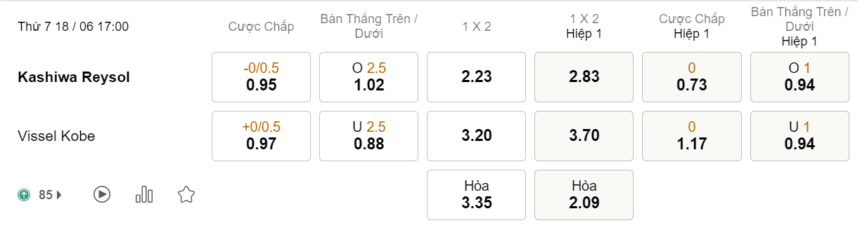 Soi kèo hiệp 1 Kashiwa Reysol vs Vissel Kobe: 0.73*0*1.17