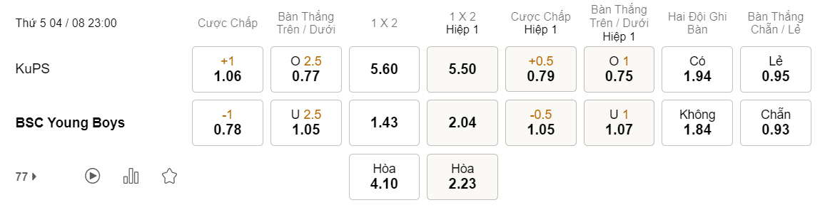 Tỉ lệ kèo KuPS vs Young Boys