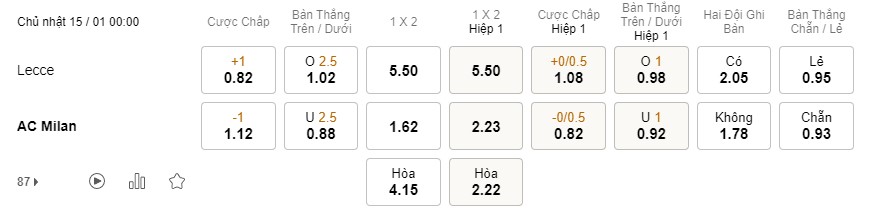Soi kèo châu Á Lecce vs Milan: 0.82*1*1.12