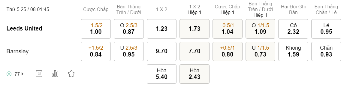 Trong khi đó nhìn sang đội khách, Barnsley để thua 2 trên 3 trận gần nhất của mình. Mới đây, đội bóng này cũng thua bạc nhược 0-3 trước Wycombe và rõ ràng tâm lý của họ đang là không tốt. Vì vậy các chuyên gia nhận định, lựa chọn Leeds trong trận đấu này sẽ là chính xác hơn.