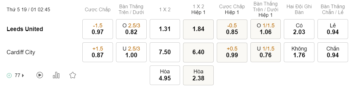 Soi kèo châu Á Leeds vs Cardiff: 0.97*1.5*0.87