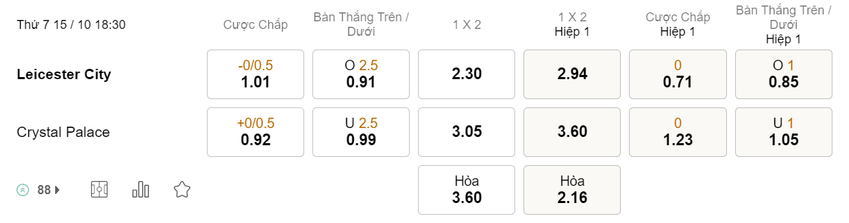 Soi kèo châu Á Leicester vs Crystal Palace: 1.01*0/0.5*0.92