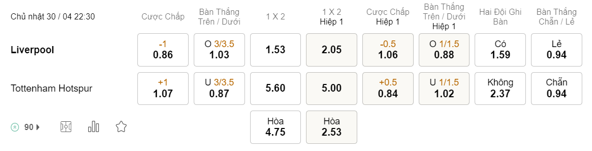 Tỉ lệ kèo Liverpool vs Tottenham