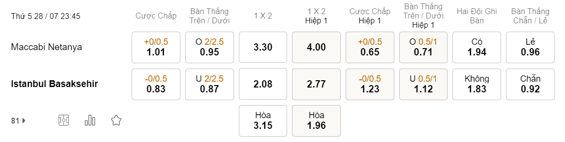 Soi kèo hiệp 1 Maccabi Netanya vs Basaksehir: 0.65*0/0.5*1.23