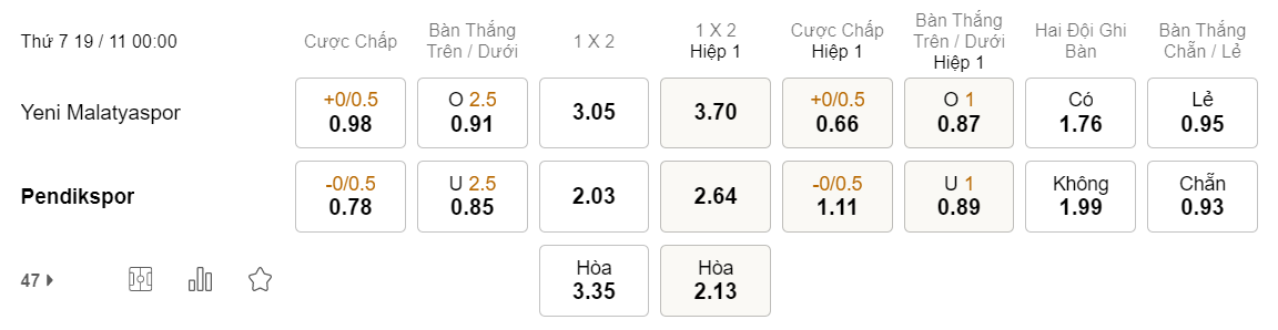 Pendikspor đang duy trì lối đá đề cao sự chắc chắn để làm tiền đề cho thành tích ổn định thời gian qua là điều ai cũng dễ dàng nhận thấy. Hơn nữa, 3/5 lần gần nhất 2 đội đối đầu, NHM đã không thể chứng kiến bàn thắng xuất hiện trong hiệp 1. Vì vậy khả năng cao 45 phút đầu tiên của cuộc trạm chán này sẽ khép lại mà chưa có bàn thắng nào được ghi.