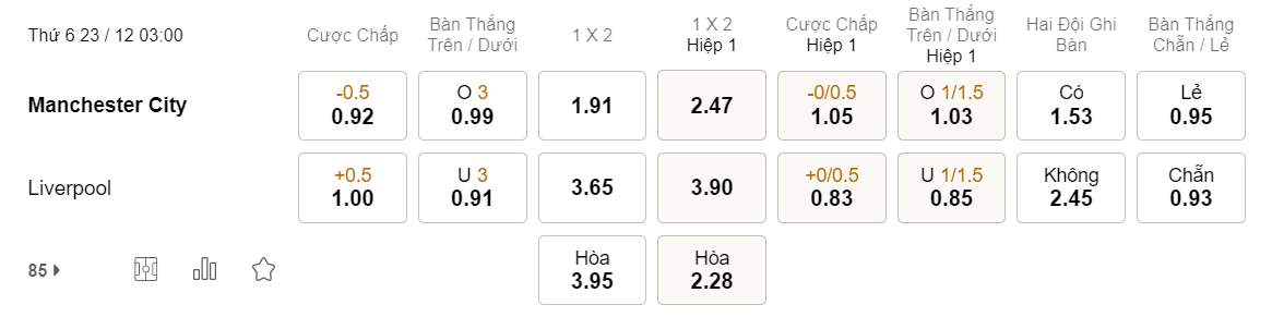Soi kèo hiệp 1 Man City vs Liverpool: 1.05*0/0.5*0.83