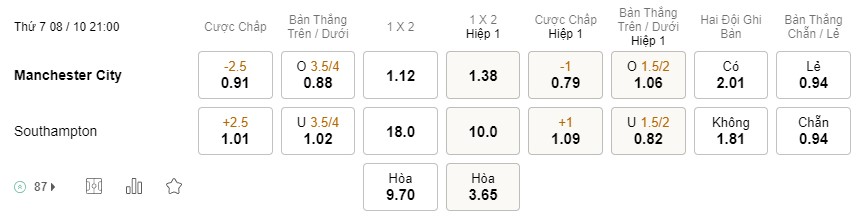 4/5 trận gần nhất Man City đối đầu với Southampton, NHM đã được chứng kiến bàn thắng tới ngay trong hiệp 1. Với sự chênh lệch quá lớn như ở thời điểm hiện tại và lại còn được chơi trên sân nhà, các chuyên gia nhận định, việc Man City sớm tìm được đường vào khung thành Southampton trong hiệp 1 là khá rõ ràng.