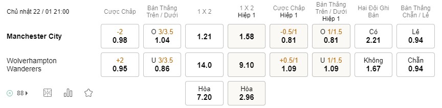 Tỉ lệ kèo Man City vs Wolves