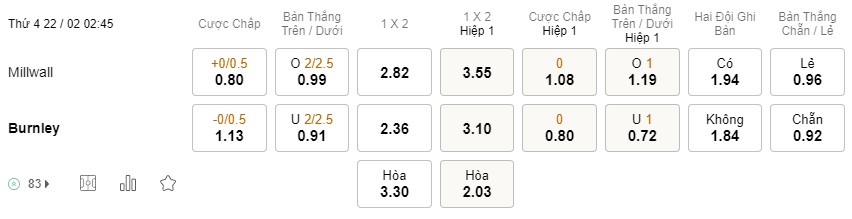 Tỉ lệ kèo Millwall vs Burnley
